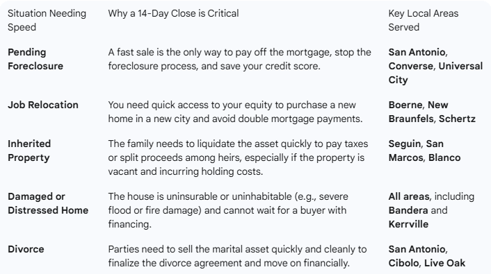 For a homeowner in a time-sensitive crisis, such as a pending foreclosure on a property in Pleasanton or Lytle, waiting 60 days for a sale to close, only to have it fail at the last minute, can be catastrophic.